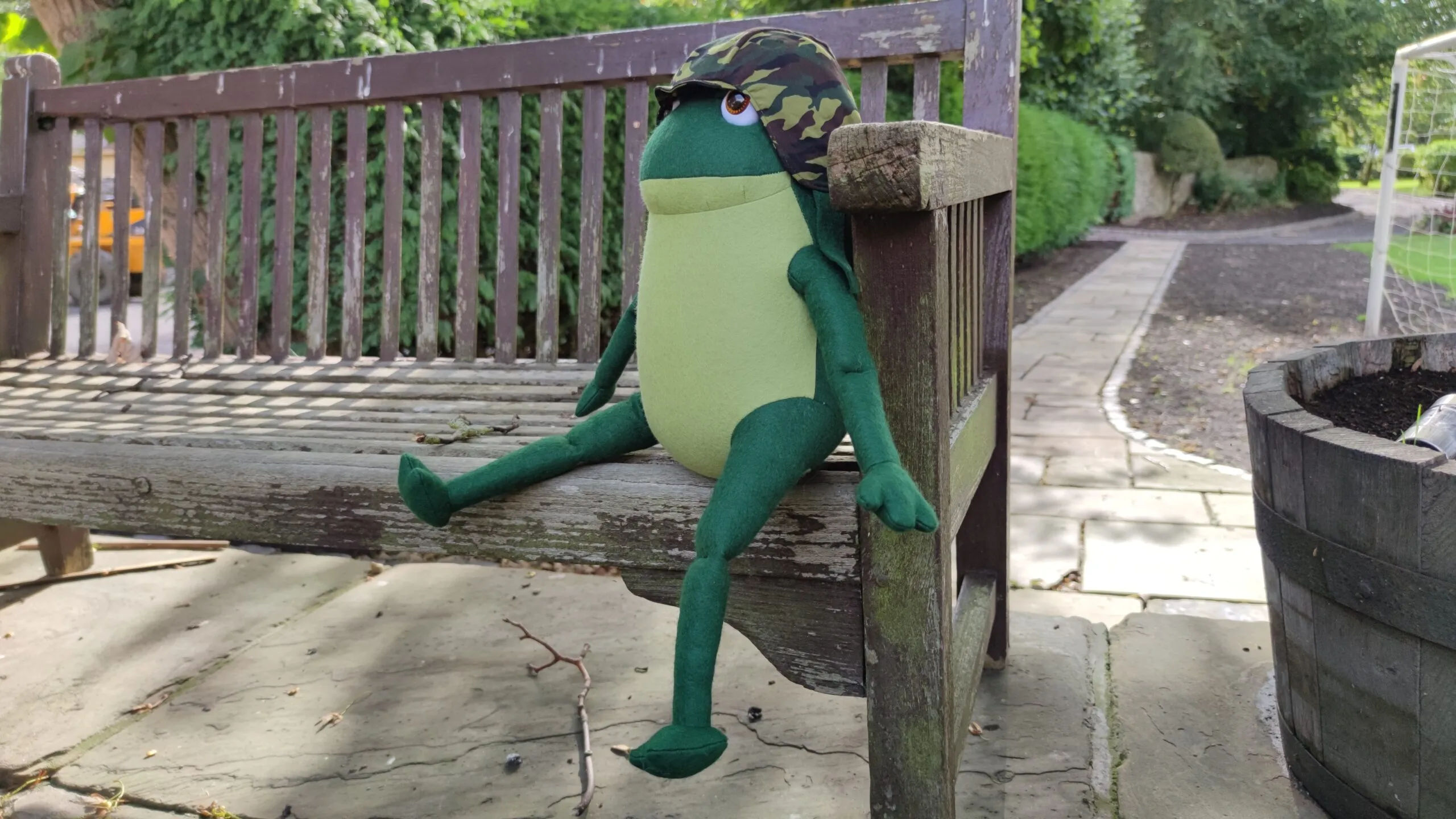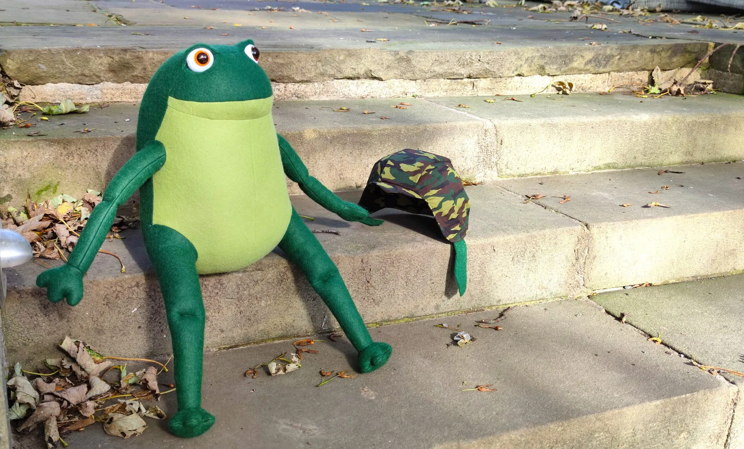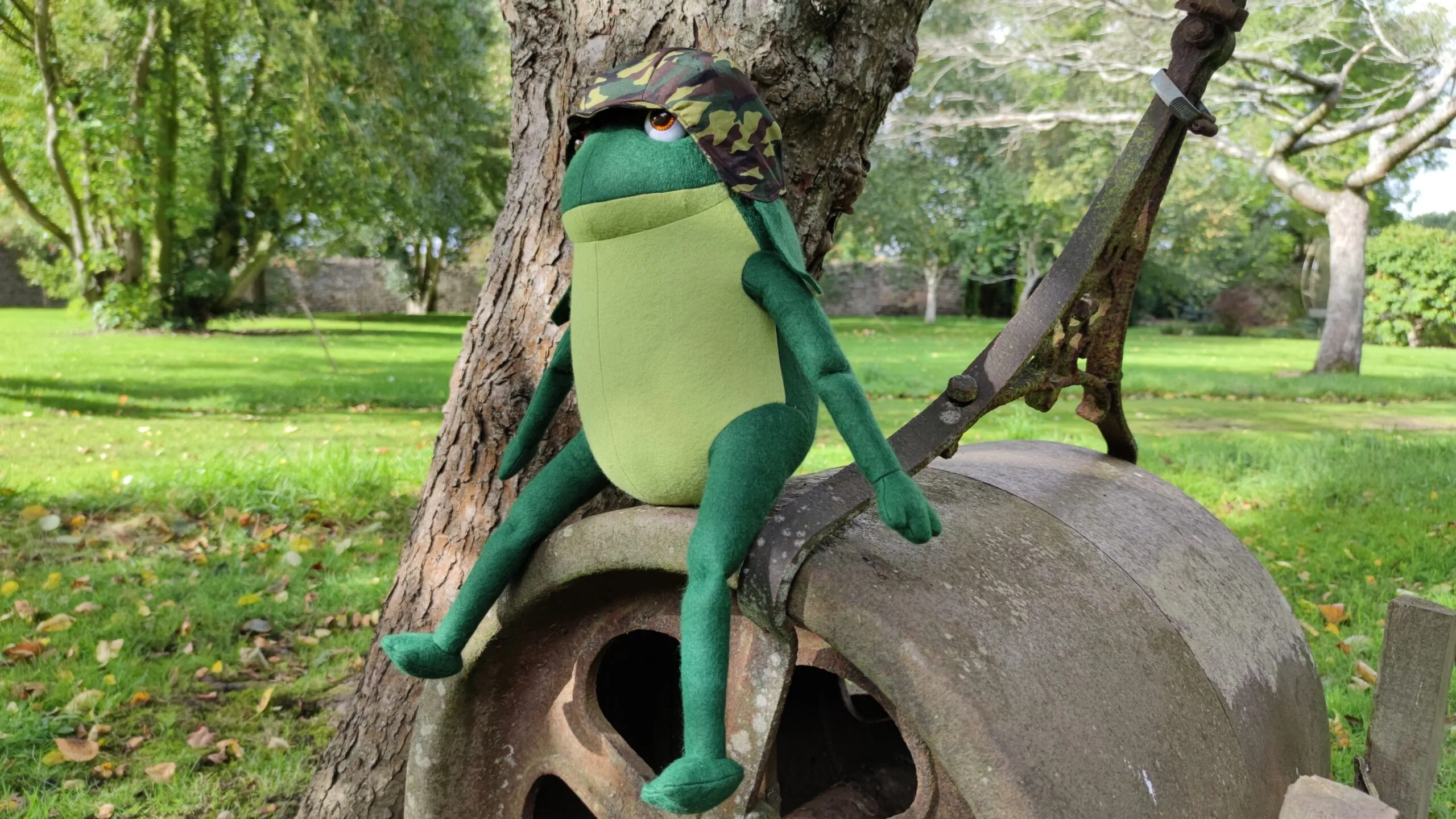 Froggy is a handmade bespoke collectable , created with care and intention. He was made especially for our dear friend who is currently in Ukraine, where the war continues. Froggy, with his signature camouflage hat, has become a constant companion, offering quiet comfort and strength during uncertain days.