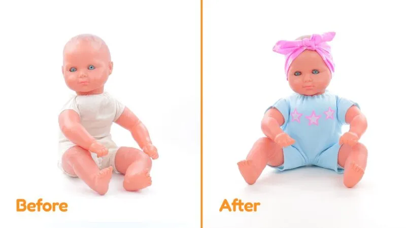 This is Baby Doll, a cherished companion who once spent every single day by the side of a young lady during her childhood. Years of love, play and cuddles had left Baby Doll in need of some serious restoration — her fabric body was worn, her eyes had dulled, her lashes had disappeared, and her plastic parts showed the marks of time.