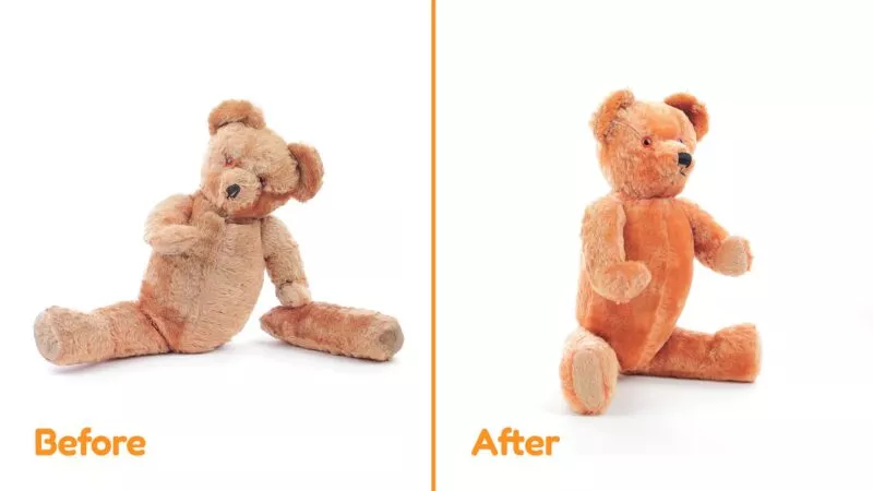 Restoring Classic Teddy Bear to his former glory took time, skill and a great deal of care. Our expert toy restoration team began with a thorough but gentle clean to refresh his fabric while preserving his familiar feel. His missing eye was carefully replaced to match his original look, and his leg was reconstructed and reattached to ensure both strength and softness. Worn areas were re-stitched by hand, and his stuffing was topped up to restore his shape and snuggly charm.