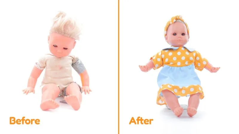 Our skilled restoration team got to work with patience and precision. Dolly was given a gentle but thorough clean to freshen her delicate fabric. Her seams were hand-stitched to secure her limbs, and new stuffing was carefully added to restore her original shape. Her hair was replaced and styled to suit her sweet character, and she was fitted with a beautiful handmade dress to match her charming smile.